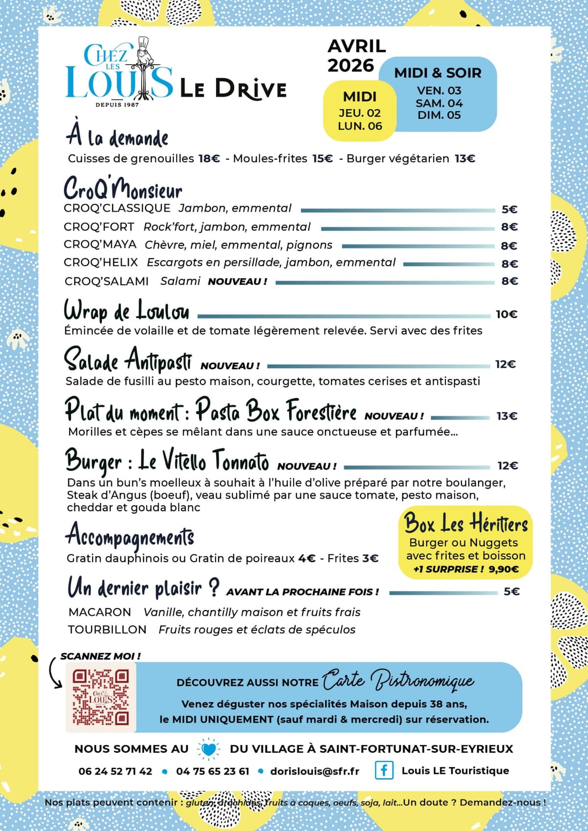 Vous avez déjà vu un drive piéton ? Approchez-vous de notre grande fenêtre côté cuisine. Notre équipe vous a préparé une carte simple : un burger différent chaque semaine, wrap, croques-monsieur, le plat du moment et nos desserts maison. Du burger aux desserts, tout est Artisanal. Les desserts sont notamment préparés par Maxime, notre chef pâtissier. Simple, rapide et bon.