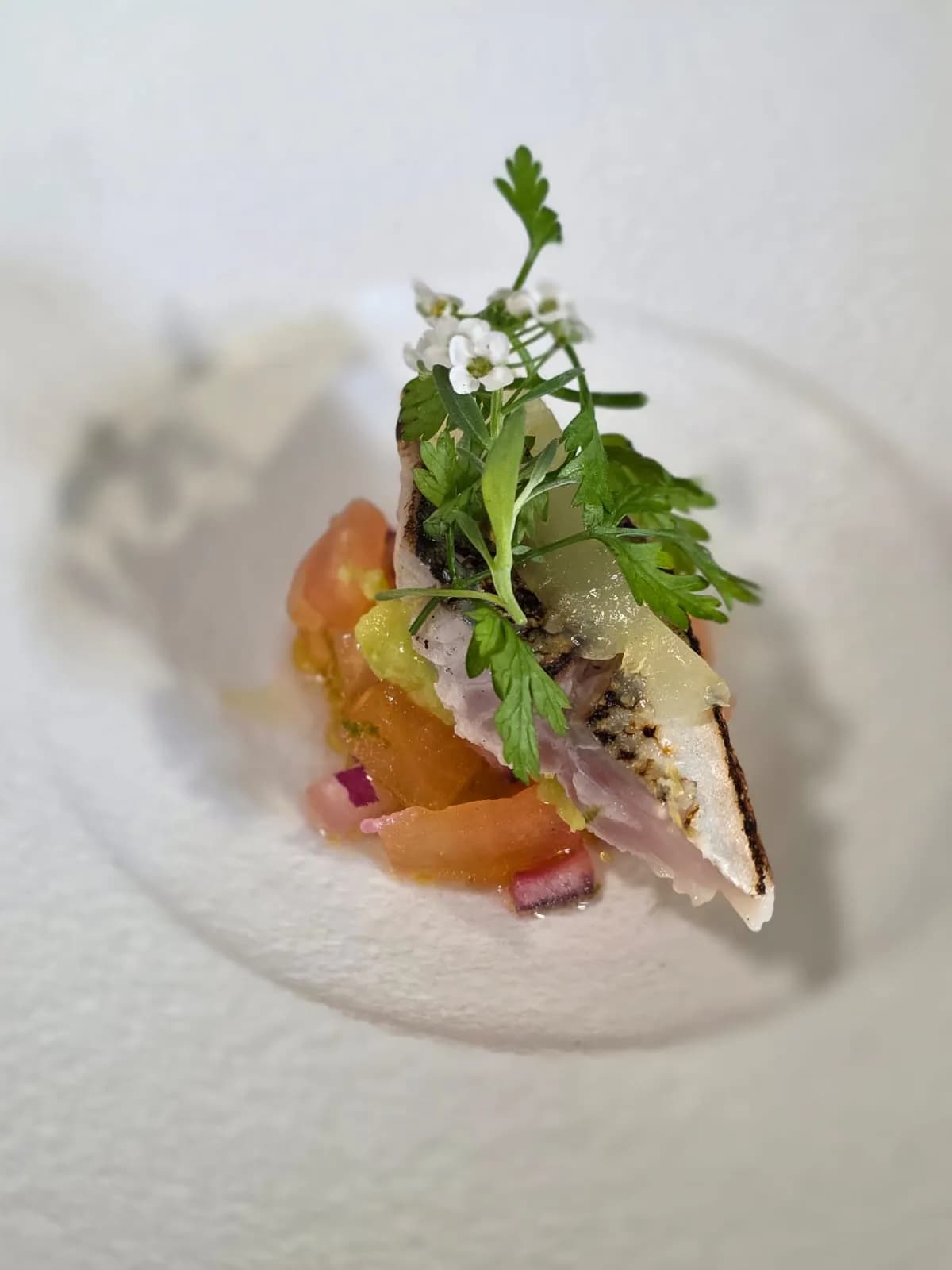 Mise en bouche maquereau à la flamme gel citron Fleurs d'iberis