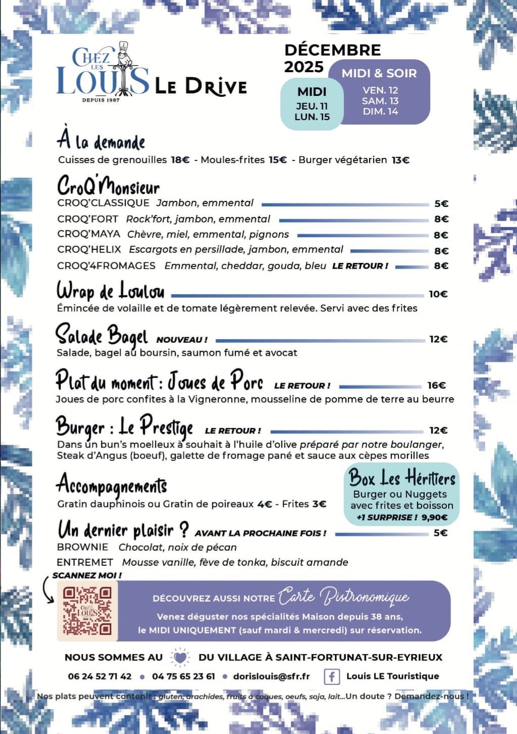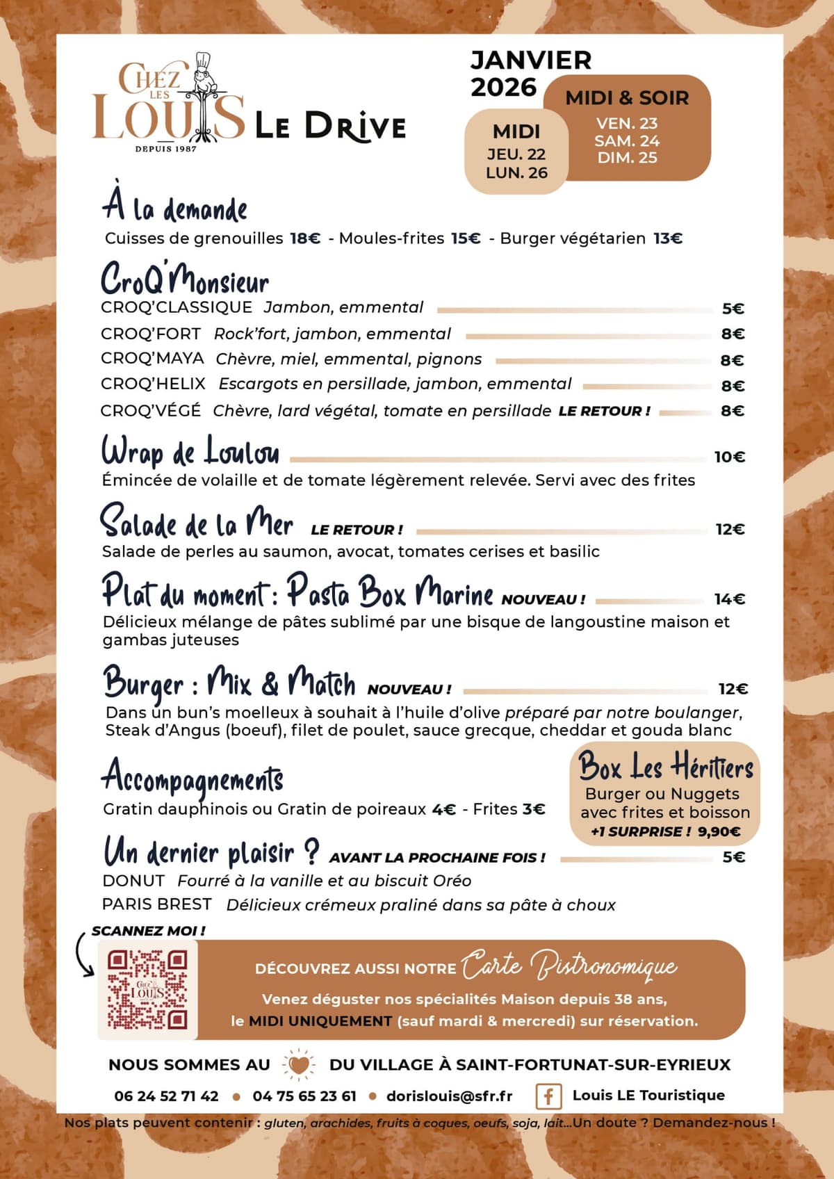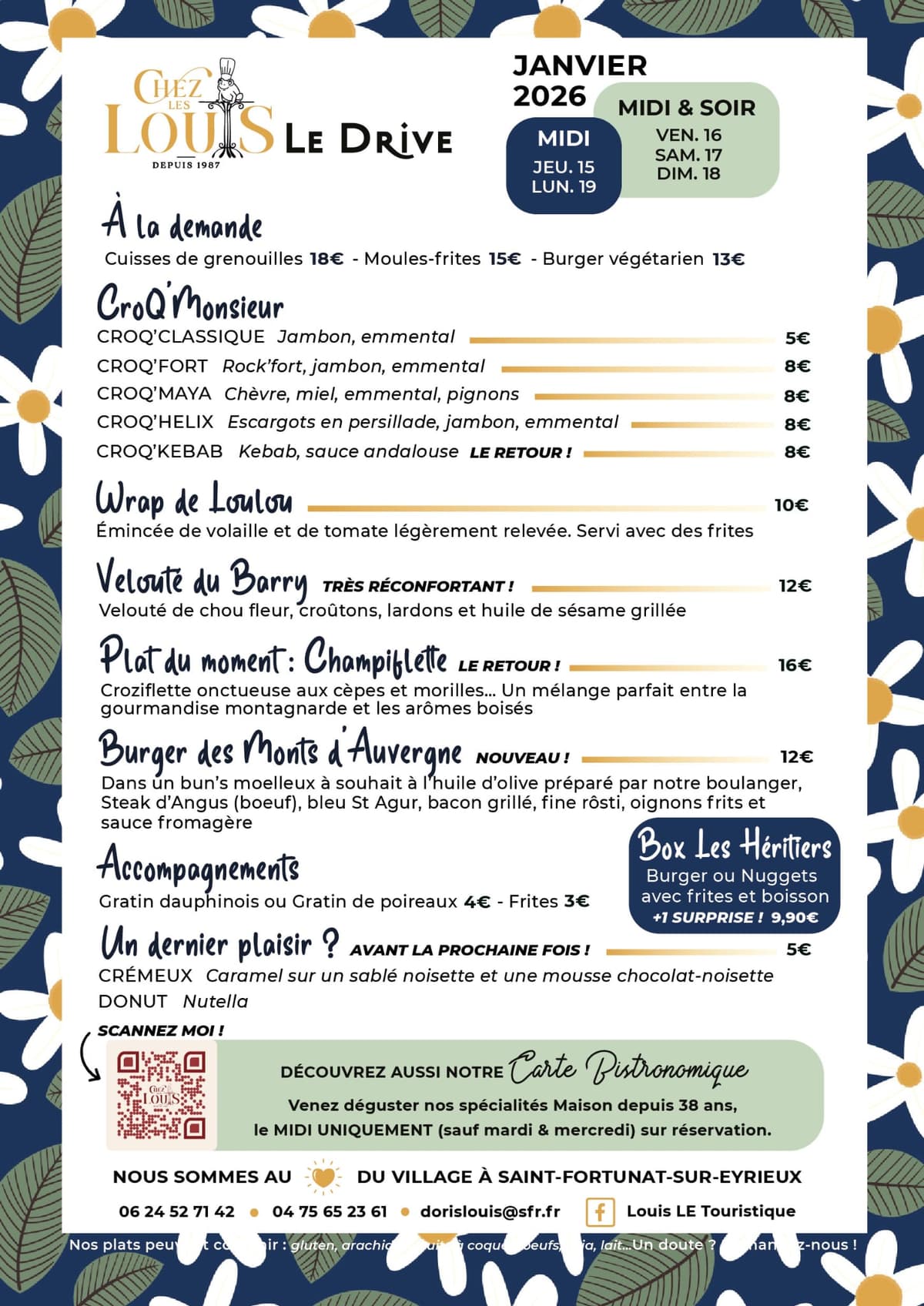Vous avez déjà vu un drive piéton ? Approchez-vous de notre grande fenêtre côté cuisine. Notre équipe vous a préparé une carte simple : un burger différent chaque semaine, wrap, croques-monsieur, le plat du moment et nos desserts maison. Du burger aux desserts, tout est Artisanal. Les desserts sont notamment préparés par Maxime, notre chef pâtissier. Simple, rapide et bon.